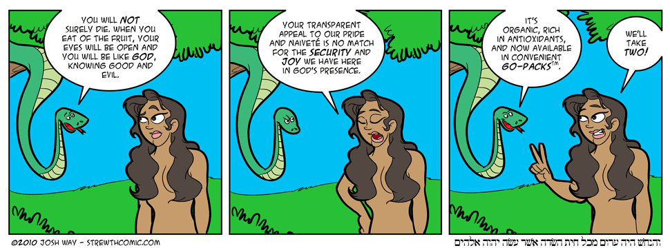 1 Now the serpent was the shrewdest of all the wild beasts that the LORD God had made. He said to the woman, “Did God really say, ‘You shall not eat of any tree in the garden’?” 2 The woman replied to the serpent, “We may eat of the fruit of the other trees in the garden. 3 It is only the fruit of the tree in the middle of the garden that God said, ‘You shall not eat it or touch it, lest you die.’” 4 And the serpent said to the woman, “You are not going to die. 5 But God knows that as soon as you eat of it your eyes will be opened, and you will be like gods who know good and bad.” 6 So when the woman saw that the tree was good for eating and a delight to the eyes, and that the tree was desirable to make one wise, she took of its fruit and ate. She also gave some to her husband, and he ate. 7 Then the eyes of both were opened and they knew that they were naked, and they sewed fig leaves together and made themselves loincloths.